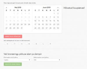 Oleme märganud, et paljud autoomanikud kirjutavad lisainfosse minimaalse rendi pikkuse. Tegelikult saab seda märkida ka auto profiili sõidukalendri juurest. See muudab keskkonnas nii rentijale kui ka autoomanikule mugavamaks, kuna rentija võib kindel olla, et otsingust tulnud sõiduk vastab tema soovidele ning autoomanikele ei tuleks liialt lühikesi või pikki rente, kui nad seda ei soovi. Seda saab teha rendikalendri all olevas osas.